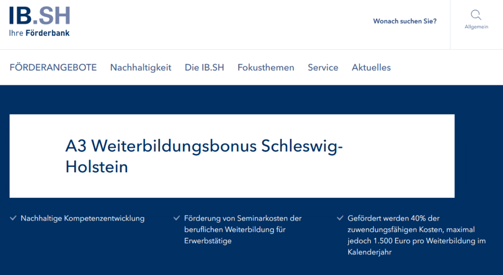 Das Land Schleswig-Holstein unterstützt die berufliche Weiterbildung von Arbeitnehmer/-innen mit dem Weiterbildungsbonus SH. Gefördert werden bis zu 40% der förderfähigen Gesamtkosten, maximal 1.500 Euro pro Kalenderjahr und Antragstellenden – finanziert aus Mitteln des Europäischen Sozialfonds Plus (ESF Plus). Der Arbeitgeber beteiligt sich lediglich mit den verbleibenden 60% der Kosten.